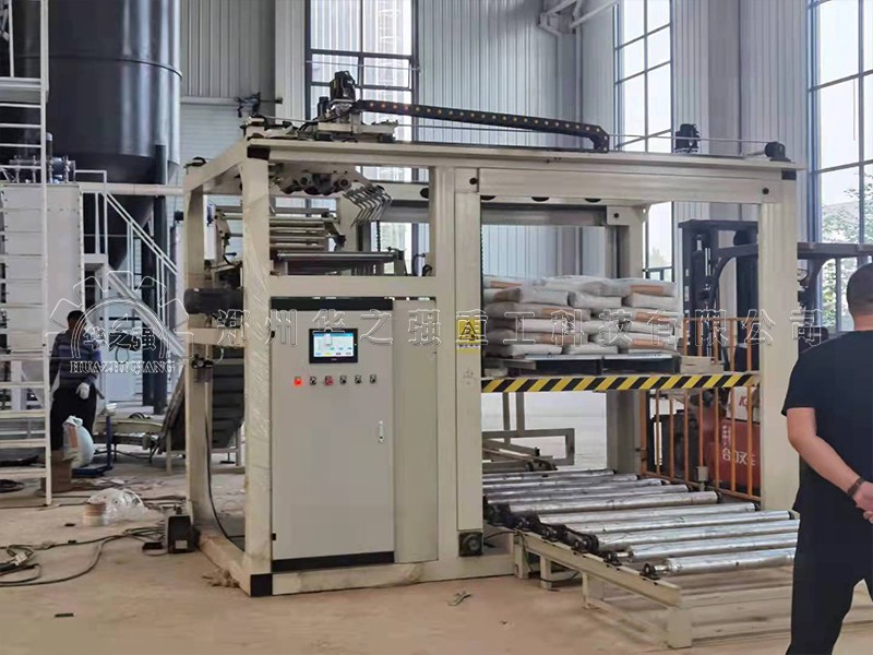 自動高位碼包機由托盤升降系統、托盤輸出系統、出垛滾輪系統、支撐擋板及電纜、下震動勻料及待抓區滾輪組、倒包平轉機(含轉向滾輪)、推包轉向機(含推包裝置)、爬坡機、滾筒輸送機、皮帶輸送機、輸送拐彎機及控制系統組成。